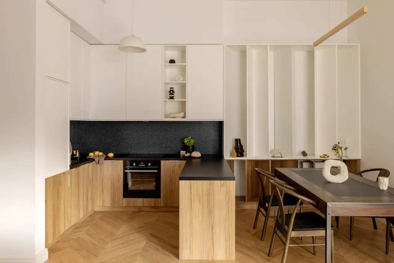 Gdzie w tym wszystkim Instagramowe trendy? Wszędzie! W kuchni pojawiają się fronty w modnym, białym macie, z którymi skontrastowaliśmy elegancki, czarny blat i zjawiskową, czarną mozaikę nad blatem. Dolne fronty szafek to mocny rysunek drewna, dzięki któremu jasna kuchnia zyskuje wyrazisty charakter.